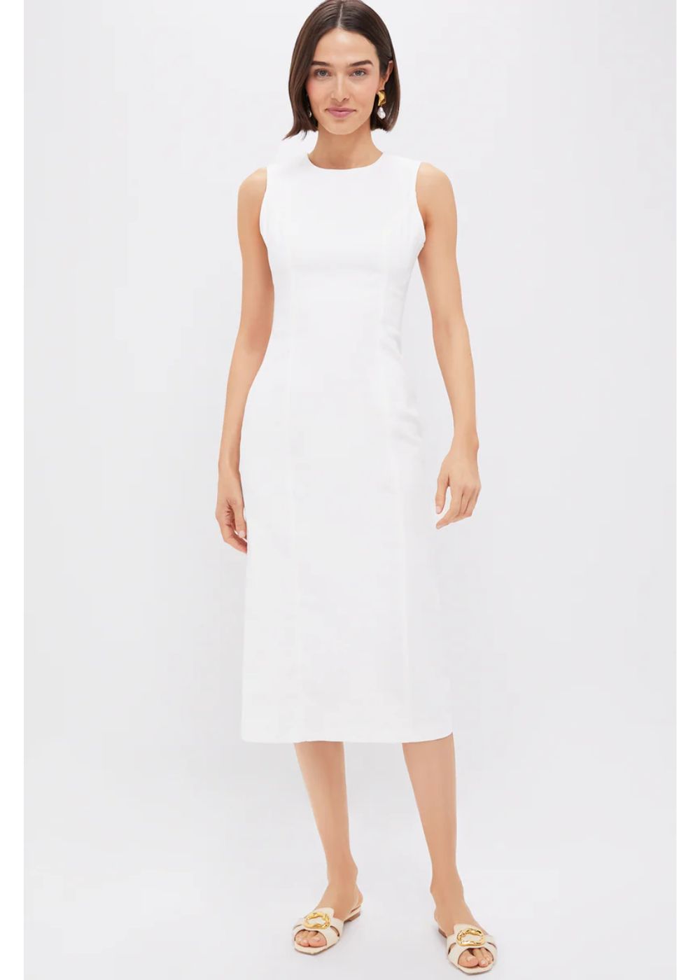 Crafted with a hint of stretch for a sculpted-yet-comfortable fit, this tailored dress reimagines classic denim with crisp, clean lines.