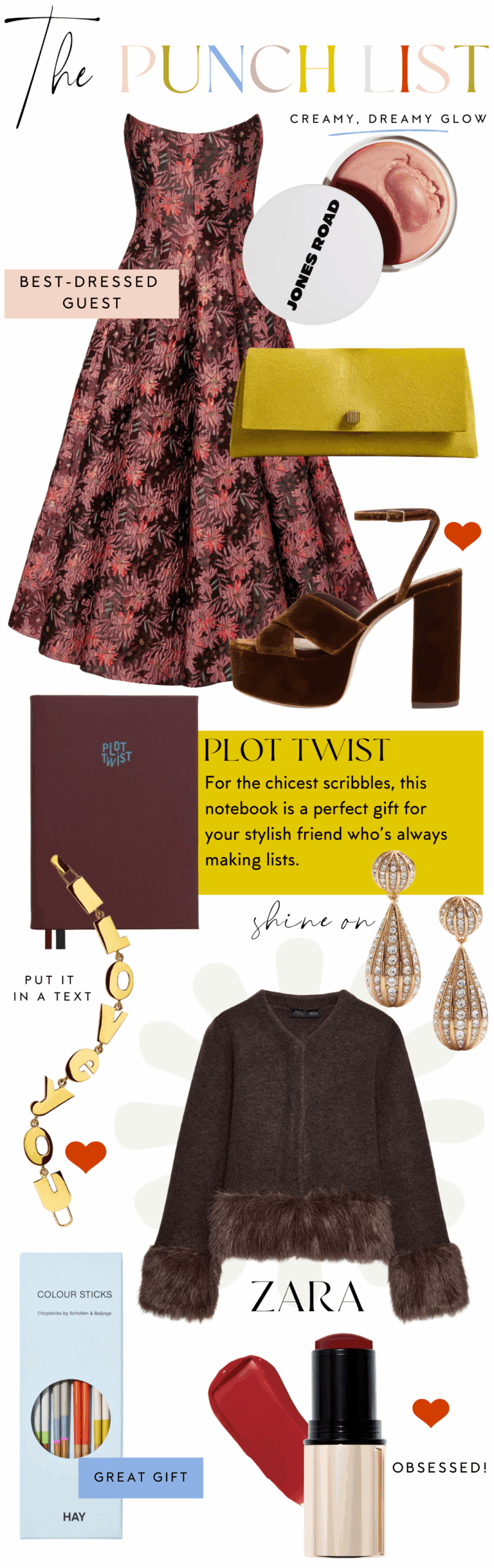 THE PUNCH LIST THE PUNCH LIST CLOCKWISE FROM TOP LEFT: DRESS // MIRACLE BALM // CLUTCH BAG // SANDALS // EARRINGS // CARDIGAN // BLUSH STICK // CHOPSTICKS // BRACELET // NOTEBOOK Turn on your JavaScript to view content