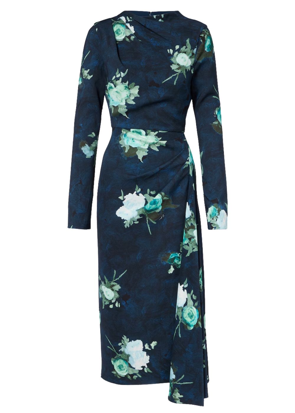 This dreamy blue floral midi from Erdem is draped to perfection and tailored to skim in all the right places. Garden party by day, cocktail soirée by night.