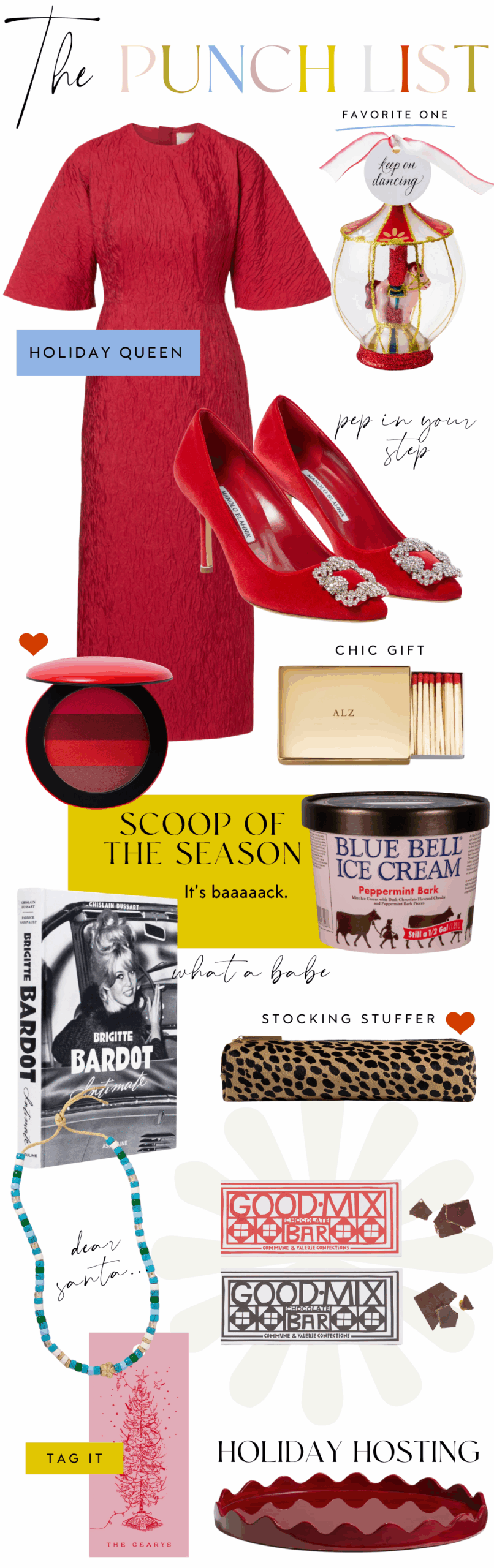 THE PUNCH LIST THE PUNCH LIST CLOCKWISE FROM TOP LEFT: DRESS // ORNAMENT // PUMPS // MATCHBOX SLEEVE // ICE CREAM // CLUTCH BAG // CHOCOLATE BAR // SERVING TRAY // PERSONALIZED GIFT TAG // NECKLACE // BOOK // LIP PALETTEĀ Turn on your JavaScript to view content
