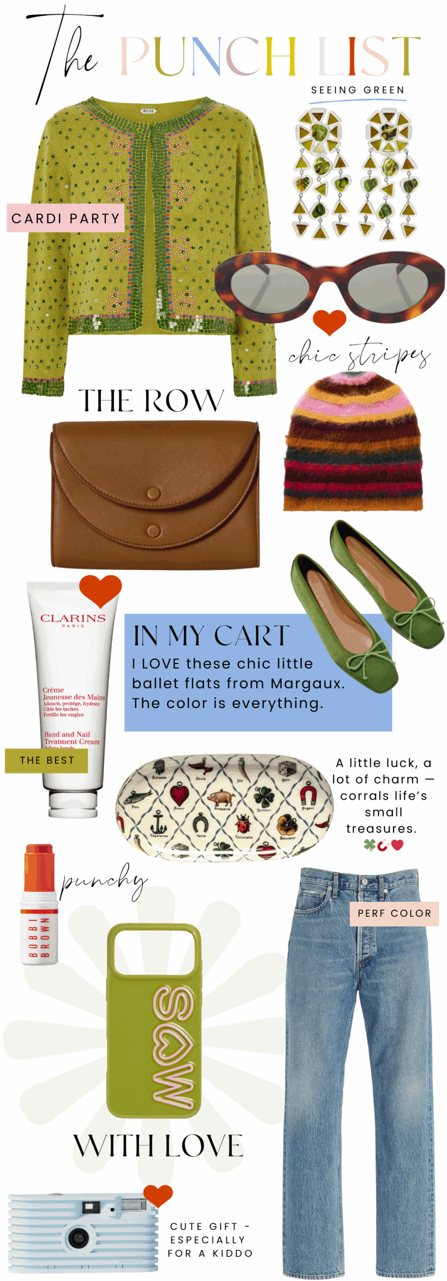 THE PUNCH LIST THE PUNCH LIST CLOCKWISE FROM TOP LEFT: CARDIGAN • EARRINGS • SUNGLASSES • BEANIE • BALLET FLATS • ENAMEL TRAY • JEANS • CAMERA • IPHONE CASE • BLUSH STICK • MOISTURIZING CREAM • CLUTCH Turn on your JavaScript to view content