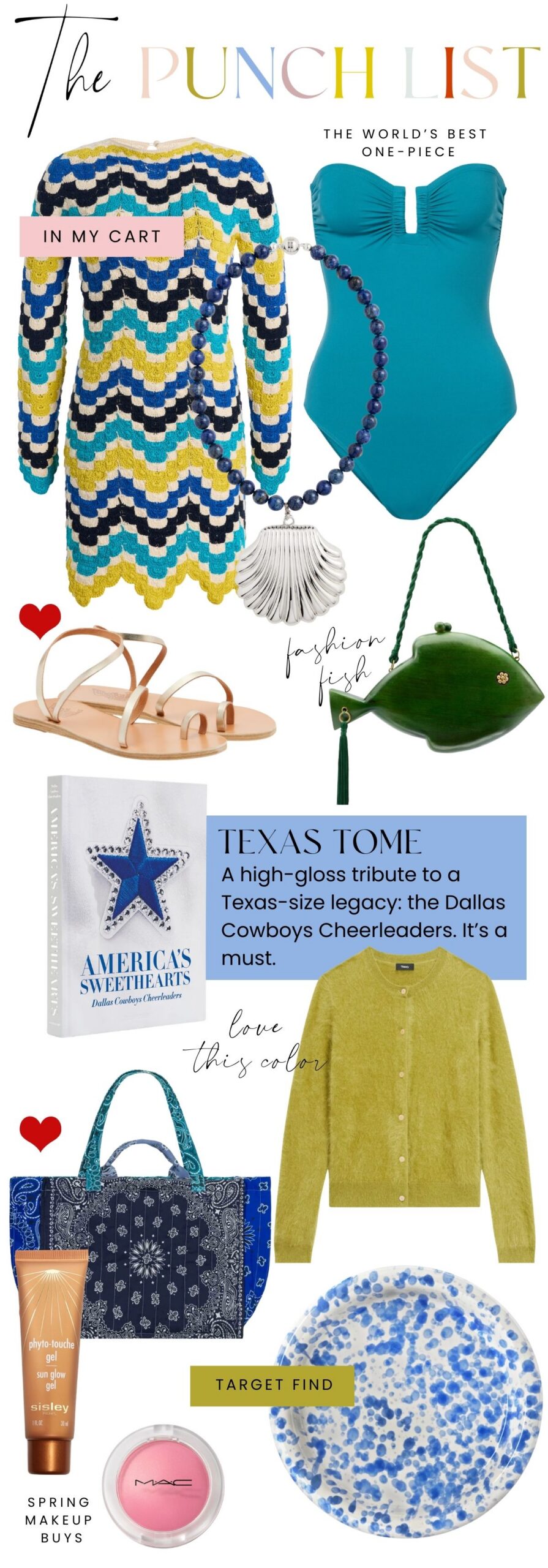 THE PUNCH LIST THE PUNCH LIST CLOCKWISE FROM TOP LEFT: DRESS • NECKLACE • ONE PIECE • CLUTCH • CARDIGAN • PLATE • BLUSH • SUN GLOW GEL • TOTE BAG • BOOK • SANDALS Turn on your JavaScript to view content